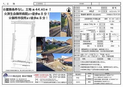 所在地奈良県御所市(西久保本町) ・建築条件なし、土地約44.40坪 ・済生会御所病院まで徒歩約8分 ・御所市市役所まで徒歩約8分 ①売主は契約不適合責任を負いません。 ②現状有姿ままでの引渡し ③境界確定図が作製されている為、境界明示は行いません。 ※利用時に税込7万円の排水分担金が必要。 |