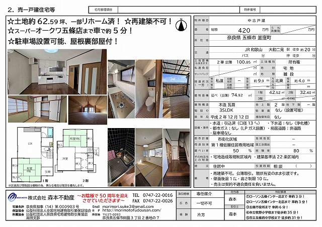 交通JR和歌山線大和二見駅より徒歩約20分 価格420万円 |