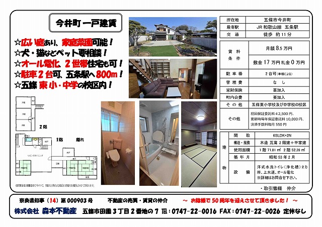 交通JR和歌山線五條駅より歩約21分 賃料11万円 諸費用敷金22万円 礼金11万円 管理費0.55万円 共益費0.55万円 |